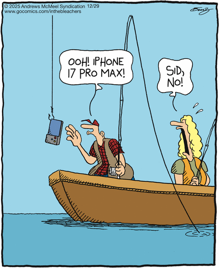 The fisherman is being fished by someone above the panel and the bait is the iPhone.
